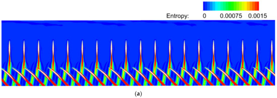 To accurately simulate the IGV disturbances and characterize their interactions with the rotor blade, the computational results for the IGV/R1 coupled configuration (Case B) were analyzed. The instantaneous entropy and static pressure contours, which can well characterize the wake and potential disturbances in the flow field, showing the wake–rotor and potential field–rotor interactions at 30% span, are plotted in Figure 6a,b respectively. The results show that the IGV wake propagates downstream and its strength weakens significantly due to blade chops when reaching the LE of the rotor blade. In terms of the IGV potential field, Figure 6b shows that it propagates upstream and downstream and its strength decays rapidly in the axial direction. Meanwhile, the dense and non-uniform distribution of contour lines near the R1 LE indicates strong IGV–R1 interactions (Figure 6b).