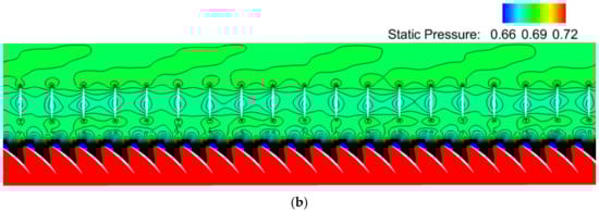 Figure 14 shows the fluctuating pressure contours of the decoupled (case A-2) and two-row IGV/R1 coupled configurations (case B), and the mode generated by IGV–R1 interactions can be clearly seen in both configurations (four strip-shaped positive and negative fluctuating pressure regions throughout the blade passage). As mentioned above, the pressure wave that may have some influence on the rotor blade in the coupled configuration is mode generated from the R1 LE and subsequently reflected by the upstream IGV, which does not exist in the decoupled configuration. In Figure 14a,b, the distributions and amplitudes of the fluctuating pressure in the R1 passage are basically the same, indicating that the strength of the reflected mode is small, thus its contribution to the R1 response is limited (shown in Table 6).