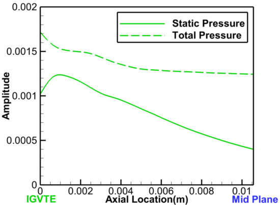 For the axial propagation characteristics of the wake and potential disturbances, the above results only give qualitative evaluations, and further quantitative analyses were needed to evaluate and compare their effects on the rotor blade. Therefore, discrete Fourier transform (DFT) of the circumferential symmetric total pressure and static pressure was carried out, and the amplitude of the first-harmonic content of the IGV wake and potential disturbances with an aerodynamic wave number of 19 (19AWN) were analyzed [31]. Figure 7 shows the axial distribution of the 19AWN amplitude, from the trailing edge (TE) of IGV to a plane mid-distance between IGV TE and IGV exit at 30% span. The reason for analyzing the midplane is that its axial location, marked as a blue dotted line in Figure 1, is less affected by IGV–R1 interactions than the IGV exit (shown in Figure 6b). The results show that the strength of the wake (total pressure line) decreases slowly at a certain distance away from the IGV TE and the amplitude decreases by 0.5% per 0.001m, while the potential disturbance (static pressure line) decays exponentially and the attenuation coefficient is 88% per 0.001 m. By comparing the amplitude of the total pressure and static pressure at the midplane, it indicates that the strength of the wake is three times larger than that of the potential field. It is worth noting that there is still a 0.029 m axial distance between the midplane and R1 LE, and it can be inferred that the strength of the potential field will decrease to 4.3% of the midplane, while the wake will only decrease by about 15%. Therefore, it can be concluded that IGV disturbances are dominated by the upstream wake and may significantly contribute to the vibration amplitude of the rotor blade, which will be studied below.