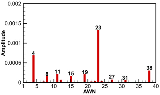 Based on the numerical data of all cases, the forced response of blades induced by upstream IGV disturbances and IGV–R1 interactions, and downstream S1 disturbances and S1–R1 interactions were analyzed, respectively. The details of each part are as follows: Firstly, the amplitude of the concerned aerodynamic wave number (AWN) was analyzed to reveal the axial propagation characteristics of stator (IGV/S1) disturbances. Next, the spinning mode theory was applied to analyze the source of rotor–stator (IGV–R1/S1–R1) interaction modes, and the acoustic properties were evaluated by solving the wave equation. Thirdly, by comparing the results calculated by decoupled and coupled configurations, the contribution of stator disturbances and rotor–stator interactions to the vibration amplitude of the rotor blade were identified. Furthermore, the mechanisms of the forced response induced by upstream and downstream aerodynamic disturbances were discussed in detail.