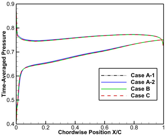 Before comparing the results for different cases, it is critical to ensure that the working conditions of the rotor blade are the same. The deviation of mass flow rate, total pressure ratio, and adiabatic efficiency among the four cases were less than 0.2%. Meanwhile, the time-averaged pressure of the rotor blade at 30% span was compared, and the results show that the blade loading of the decoupled and coupled cases is the same, as presented in Figure 9. Therefore, it is reasonable to compare the blade vibration amplitude among different cases; the results are shown in Table 6.