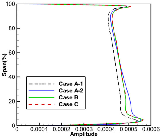 The response of all cases was normalized by the vibration amplitude of Case C, the response of Case B was only 1% less than Case C, indicating that the downstream S1 has little influence on the BM6/4ND response of the rotor blade, and the two-row coupled configuration (IGV/R1) can accurately predict the blade vibration amplitude. In terms of Case A-1 and Case A-2, the vibration amplitude predicted by the former was 21% less than Case B, whereas the latter was only 4%. To explain the difference between the results of the two decoupled configurations, the radial distribution of the fluctuating amplitude of entropy (19AWN) at the IGV exit was computed to compare the wake strength of different cases, as plotted in Figure 10. Consistent with the results reported in the literature, the wake strength of Case A-1 is lower than that of Case B or Case C in all spans because of the use of the mixing plane. Hence, the 21% difference in blade response is not only the contribution of IGV–R1 interactions but also due to the underestimation of the wake forcing function. With respect to Case A-2, the wake strength is more similar to that of Case B, being higher only at low spans, and this difference does not have a large impact on the blade vibration amplitude because the BM6 mode shape near this region is small (shown in Figure 2). Therefore, the 4% difference is considered to be mainly contributed by the IGV–R1 interactions. According to the above analyses, the dominant excitation source of the R1 blade vibration induced by upstream aerodynamic disturbances is the IGV wake, and the decoupled method is still applicable in this case.