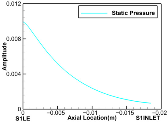 The downstream S1 only induces the potential field that excites the upstream rotor, and its axial propagation characteristic is shown in Figure 11. The amplitude of the first-harmonic content of the S1 potential field with 30AWN was analyzed for a coupled case (Case E), and the results show that the potential field decays exponentially from the S1 LE to the S1 inlet (shown in Figure 1). The attenuation coefficient is 85% per 0.001 m, and it can be inferred that the strength of the potential field will decrease to 5.9% of the S1 inlet when it reaches the R1 TE 0.0176 m away from the S1 inlet. Compared with the strength of the IGV potential field (shown in Section 4.1), it can be concluded that the S1 potential field has little effect on the vibration amplitude of the rotor blade.