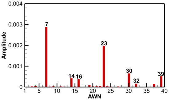 For the S1–R1 configuration, the rotor blade may also be excited by the spinning modes due to S1–R1 interactions, and the spectrum calculated by the DFT of the circumferential instantaneous static pressure at 99% span at the S1 inlet is presented in Figure 12. The formation process of S1–R1 interactions is tentatively considered to be similar to the IGV–R1 interactions, where the pressure waves are generated by the interactions between the S1 potential field and the rotor blades. Hence, the spinning modes at the S1 inlet are mainly downstream propagating pressure waves generated from the R1 row, and the source of modes in Figure 12 was identified based on the spinning mode theory, as listed in Table 7.
