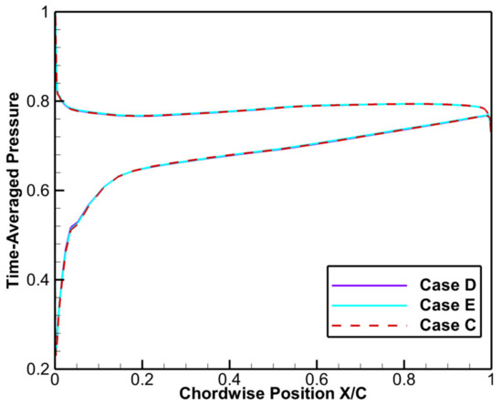 In this section, the calculated results of the decoupled (Case E) and coupled (Case D and Case C) configurations were compared to reveal the dominant aerodynamic excitation of the blade vibration. The time-averaged pressure of the rotor blade at 99% span was first compared in Figure 13, and the results show that the working conditions of the blades are the same. Then, the BM6/-7ND response of different cases was compared and the results are shown in Table 8.