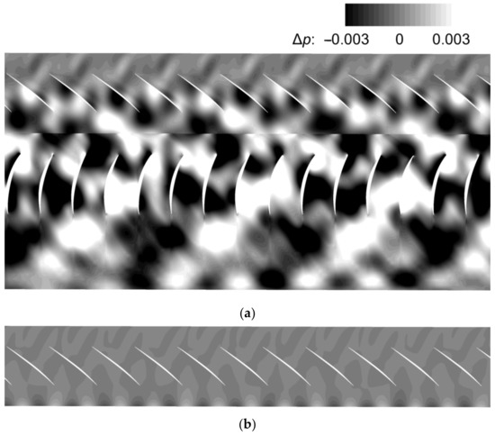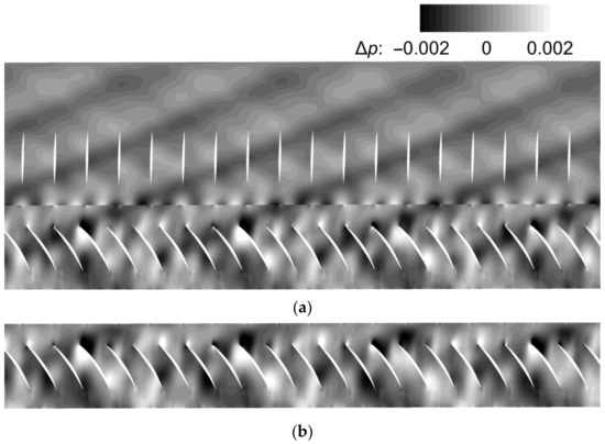 The fluctuating pressure contours at 30% span: (a) Case B (coupled IGV/R1); (b) Case A-2 (decoupled R1).