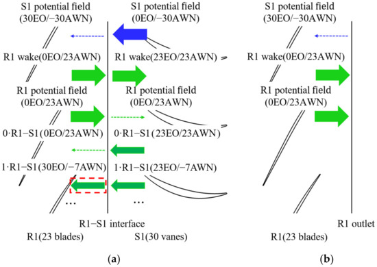 Mechanisms of the R1 forced vibration induced by upstream and downstream aerodynamic disturbances are presented in Figure 16 and Figure 17, respectively. The thick blue arrow represents the disturbances from the upstream IGV or the downstream S1, and the thick green arrow presents the rotor–stator interactions or the disturbances from the embedded R1. Meanwhile, the green and blue arrows with thin dashed lines represent the cut-off pressure waves or the reflected pressure waves. Figure 16 shows that the dominant upstream excitation source of the R1 response is the IGV wake. Since the upstream wake can be applied as the R1 inlet BC in a single-row configuration, shown in Figure 16b, the vibration amplitude of the rotor blade can be predicted by the decoupled method. In the aspect of the R1 vibration induced by the downstream S1 disturbances and S1–R1 interactions, the S1–R1–interaction mode is dominant, as depicted in Figure 17. Because the decoupled configuration cannot take this effect into account (shown in Figure 17b), it is necessary to use the coupled method to accurately predict the vibration amplitude.