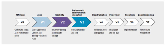 Regarding the efficient support to transfer new operational concepts toward implementation in the ATM sector, EUROCONTROL published the European Operational Concept Validation Methodology (E-OCVM) already in its third version in the year 2010 [6]. The manual describes the validation process as one necessary part of the development of a new system leading to identification of the operational needs and establishment of appropriate solutions [6]. Within the system development, different validation phases [V0–V7] are defined; see Figure 1. Those validation phases are related to the technology readiness level (TRL) as defined by NASA [7].