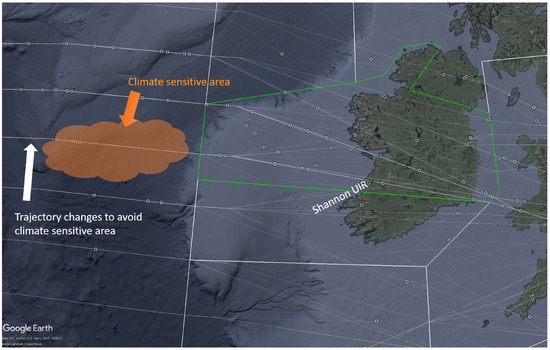 The climate-sensitive area affects one North Atlantic track; see Figure 3. For the climate-sensitive scenario, flights are re-routed either to a Northern or Southern track depending on their original exit point out of the Shannon area so that the resulting route is as short as possible. Since the main focus of this scenario was to avoid contrails in a climate sensitive area, slightly longer routes that may lead to minor additional fuel consumption were accepted in this scenario. The resulting traffic data for both scenarios and the Shannon boundary as the area of interest were fed into the simulation environment as illustrated in Figure 3.