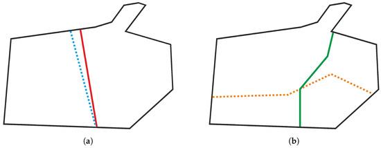 Figure 4. Sectorizations. (a) Main sectorization 0 (blue dotted line) and interim sectorization 1 (red line). (b) Interim sectorization 2 (green line) and main sectorization 1 (orange dotted line).