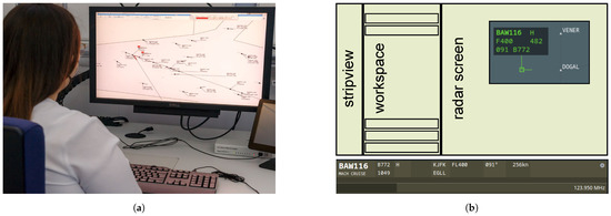 Figure 6. Display for the controller and simulation pilots. (a) Controller Display and Simulation Tool (CoDiST) implemented within ATMOS. (b) IRIS Display for simulation pilots divided into three sections: stripview, workspace and radar screen.