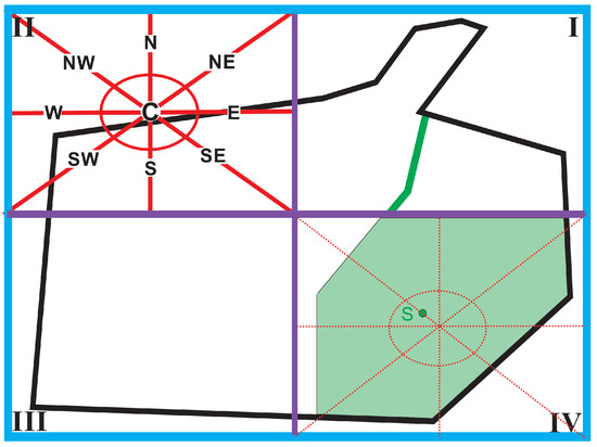 The center area is an ellipse where the center is the center of the corresponding section, and the length of the major/minor axis is 1/3 of the section’s north–south/east–west extent. The centroid of that part of the sector located in this quarter determines an additional identifier for the sector. For centroids inside the center area, the additional identifier `Center’ is used, and, for all other positions, the identifier of the closest direction line. In the unlikely case that two sectors have the same identifier, an additional number is added in dependence of the position of the center of gravity increasing from left to right.