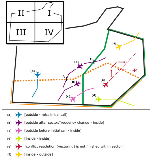 To finalize a set of different simplified cases that could occur when the DAS concept is applied, the constructed and recommended actions are discussed in Table 3. These cases include general situations that do not cause any responsibility issues. Additionally, the seven discussed situations where procedures need to be clarified from Section 5.1. Figure 9 displays those situations as a set from (a) to (f). Thereby, the green sector is the initially active sector, referred to as sector one. After the sector boundaries change due to DAS, the sector surrounded by orange dashed lines will be the active sector, referred to as sector two.