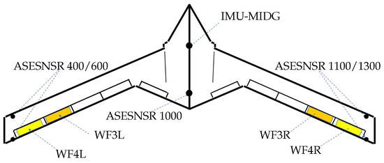 For the active suppression of the BFF phenomenon, the outer flaps are allocated as control inputs, denoted as and . As shown in Figure 1, the former denotes the symmetric deflection of the flaps WF3L and WF3R, and the latter corresponds to the symmetric deflection of the flaps WF4L and WF4R. There are 3 measurement outputs. The pitch rate is measured by an IMU-MIDG gyroscope, the acceleration at the center body is measured by an ASESNSR 1000 accelerometer, and is a processed integrated signal measured by four wingtip accelerometers, ASESNSR 400, 600, 1100, 1300.
