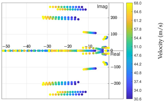 To help the reader easily understand the modal matching algorithm, the poles (which are also the eigenvalues of the state matrix) of the X-56A aeroservoelastic system are shown in Figure 2. The poles migrate when the airspeed varies and create trajectories in the complex plane. A modal matching algorithm is a systematic approach to pairing the eigenvalues and eigenvectors. When the scheduling parameter varies from to , it can automatically find the migration of each eigenvalue, and the same is true for the corresponding eigenvector.