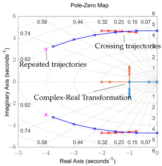 (2) Crossing trajectories. When two eigenvalue trajectories intersect, the multiplicity is 2 at the intersection point. The complex–real transformation is a special case, in which the intersection happens when two conjugate poles meet on the real axis and the damping ratio varies from underdamped to critically damped and overdamped.
