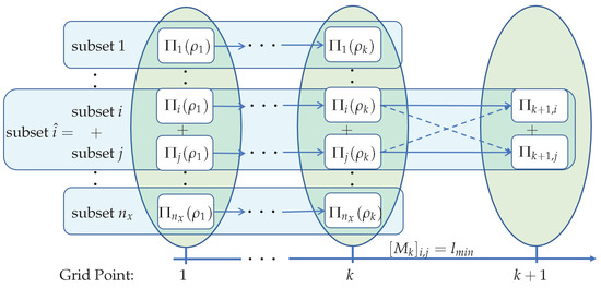 As shown in Figure 3, the i-th eigenvalue trajectory and the corresponding information and are defined as subset i. During the matching process, a structure array is used to record the data in a subset, which is updated at each step by appending the paired eigenvalues. The algorithm starts from the first grid point where the i-th eigenvalue is labeled as and assigned to subset i. Then, the eigenvalue at the next grid point is detected, paired, and recorded in the subset (labeled as ). The second step is repeated point-by-point. The elements in subset i eventually form the eigenvalue trajectory , where is the number of grid points. The corresponding eigenvector trajectory is also recorded to generate the desired consistent transformations , where .