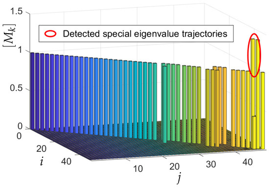 The existing matching algorithm is based on the assumption of a one-to-one correspondence for eigenvalue trajectories. However, as shown in Figure 4, if eigenvalues and are identical, Equation (12) will give the same distance values, and it is not clear which eigenvalue should be paired.