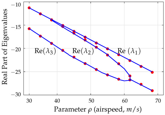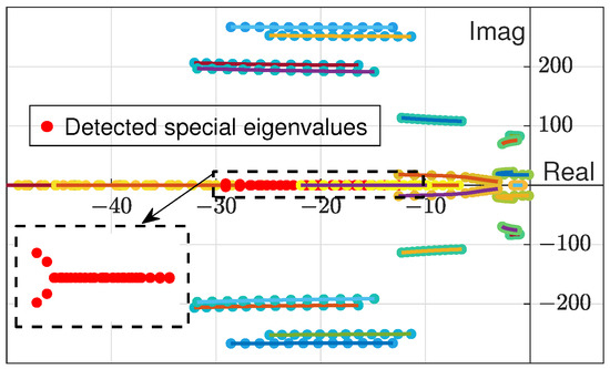 After merging the special subsets with multiple eigenvalues and subsets with complex conjugate trajectories, the 48 subsets were reduced to 37 subsets. The paired trajectories are shown in Figure 9, where the detected special eigenvalue trajectories in red dots belong to subset 35. The corresponding real parts of the eigenvalue trajectories are shown in Figure 10. It can be observed that part of the trajectory is overlapped with the trajectories and as a form of complex–real transformations (the second special case given in Section 2.4) at different grid points. Such a situation is difficult to handle by smoothing the eigenvectors [4], while the proposed method skips this complex procedure and constructs consistent transformations, and , directly using the oblique projection .