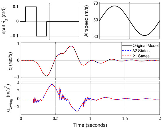 Doublet pulse responses of the original system (48 states) and the reduced-order models (21 states and 32 states).