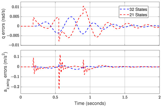 To further verify the practicability of the proposed modal matching algorithm, the frequency range was limited between 0.1 Hz and 30 Hz, and then 16 subsets with 21 state variables were reserved. The modal residualization method is used to keep the information between 30 Hz and 50 Hz as much as possible. Figure 13 shows the output responses of the system for a doublet pulse input. The time-domain simulation shows that both the reduced-order models with 21 and 32 state variables have high-fidelity responses of the pitch rate q and the high-frequency acceleration relative to the original model. To better see the difference between the original system and reduced-order models, time-domain responses are also given in terms of errors. As shown in Figure 14, the model with 21 states has larger errors than the one with 32 states.