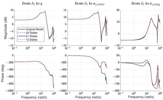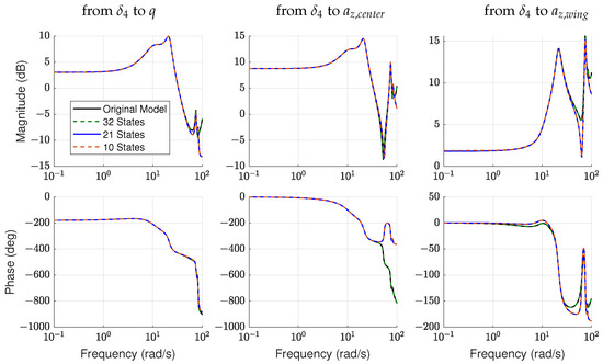 The frequency responses of two reduced-order models are also compared with the original system. Their Bode diagram plots on the grid point 5 at 44.2 m/s are shown in Figure 15. Note that it is inevitable to lose some information within 30 Hz and 50 Hz for the reduced-order model with 21 states, although this is not clearly shown in the time-domain simulations.