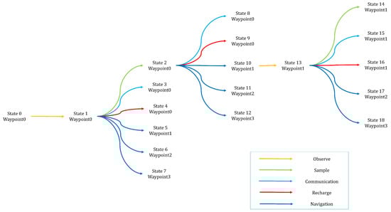 Partial view of a decision tree for a rover exploring an unknown environment, touching different waypoints during its mission. The different actions bring to different states defined in terms of the rover energy, data, and sampling storage.
