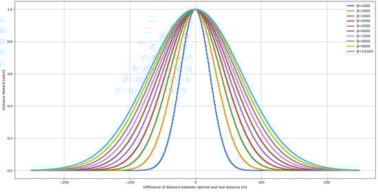 Equation (2) tends toward one when the x evaluated in Equation (3) tends toward zero. The factor  quantifies the boundaries from which there is a sensitive increment of the reward related to distance, as showed in Figure 4. For the simulations of this paper  is assumed to be equal to 1000.