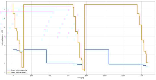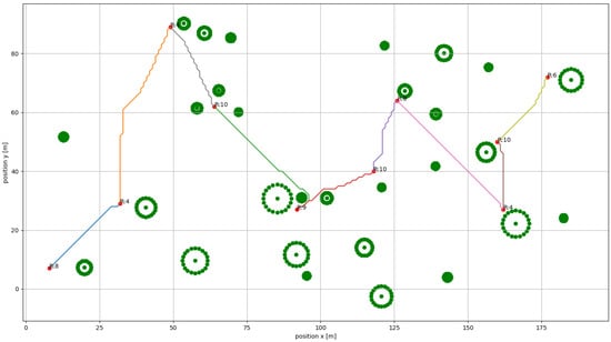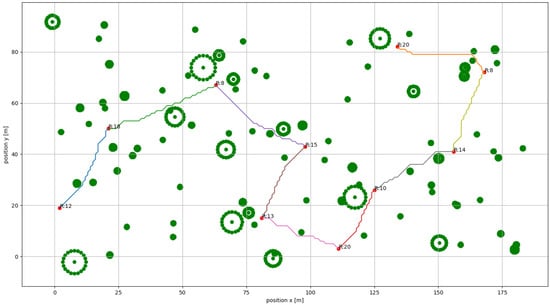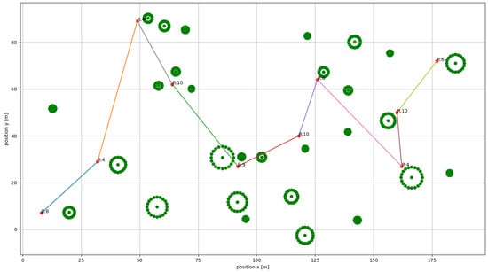 The weights  and  sum up the unity. In the simulation results presented at the end of this section, the weights are: , . The algorithm works well when the reward is between 0 and 1. Therefore, the final value of  is set to be at most equal to unity. For the simulations in this paper, the system had enough resources to communicate and recharge only two times over the ten touched waypoints. The  is evaluated as in Equations (2) and (3), where: