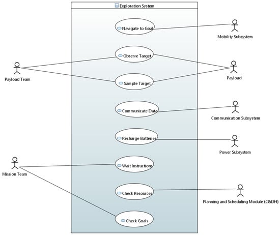 Model-based systems engineering is a discipline that emphasizes the use of models to design, develop, and test all parts of a system []. MBSE aims to shift the systems engineering paradigm from a document-centric approach to a coherent model from which the typical systems’ engineering documents are derived. The MBSE model includes a functional architecture (encompassing functions, use cases, activities, actions, and states of the system) and a physical one (including physical elements, resources, and variation law of those resources). In this study, the functional architecture includes the operational capabilities that the system can perform. Each of these capabilities is associated with a physical element that can perform them. The first step is the definition of the functional architecture. During the design formulation phases, it is possible to generalize a set of operational capabilities for a given system, as studied in []. The operational capabilities are high-level functions responding to a mission statement []. From a SysML point of view, they can be identified as primary use cases. Regardless of the mission architecture, the authors propose to generalize a set of common operational capabilities for rover-like planetary exploration systems: