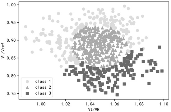 In general, the overall characteristics of such pilots during flights are classified into two or three categories [31,32,33,34] in the research field of transportation. Based on the current research results and relevant requirements in civil aviation flight practice, the GMM clustering method was utilized in this paper to cluster the pilot operation characteristics according to the dataset. The pilot operation characteristics of the fleet were divided into three classes, as depicted in Figure 2.