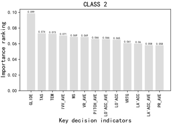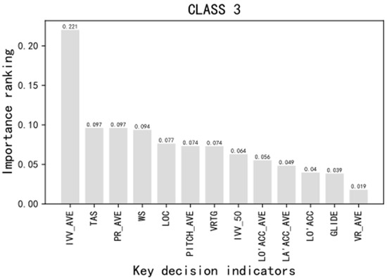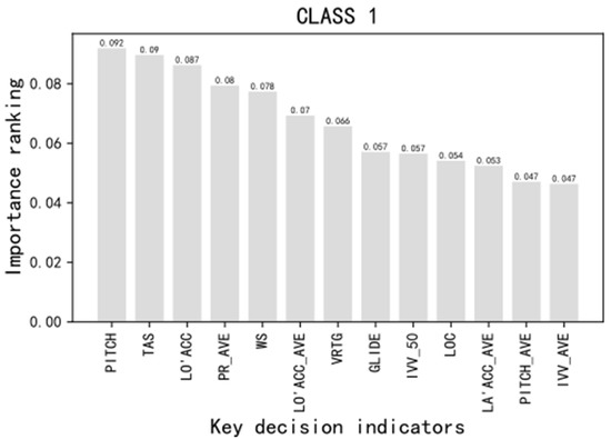 The importance ranking of the warning indicators for the three classes could be derived by analyzing and sorting out the model’s pre-warning process, as shown in Figure 10, Figure 11 and Figure 12. Figure 10 shows that pitch, TAS, and LO ‘ACC are the key indicators for the pre-warning model used to make decisions when pilots in the Class 1 operation characteristics group perform long landing pre-warning. For pilots in the Class 2 operation characteristics group, the key indicators for the decision-making of the warning model were the GLIDE, TAS, and TEM, which are shown in Figure 11. Figure 12 further shows that the key decision indicators for pilots in the Class 3 operation characteristics group were IVV_AVE, TAS, and PR_AVE.