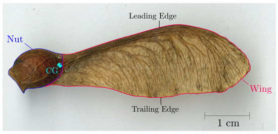 In this research, we are particularly interested in the Sycamore maple, Acer pseudoplatanus, the most common Maple species in Europe [11], for which its form can be seen in Figure 1. They are characterised by a relatively heavy round nut that capsules the seed, and an exceptionally thin and light wing, which is reinforced by a thick leading edge. These samaras fall from the tree on a windy day and once detached, their chordwise and spanwise mass distribution allow them to autorotate [12,13]. This autorotation is said to produce a condition for exceptionally high lift and drag, which counters the force of gravity and slows down the descent of the samara. In turn, the slower descent gives samaras a longer time for them to be blown sideways by crosswinds and consequently, increases the probability to be dispersed further. In fact, it is known that with the help of up-gust, samaras can travel from a few meters to several kilometers from the parent tree [14,15]. This phenomenon, known as autorotation, is not new in the aerospace sector as it has already been used by autogyros and helicopters for unpowered rotor conditions [16,17]. Despite their tiny wing featuring very low aspect ratios, samaras seem to be masters of autorotation, as they descend at incredibly low vertical speeds of under 1 ms in still air conditions, which is much slower than many have anticipated [18,19].
