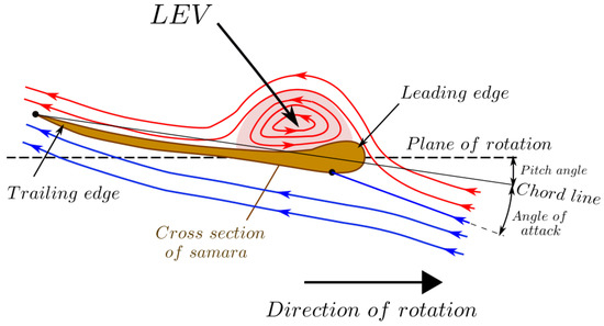 The secret for the slow descent and extraordinary lift comes from the ability of the samara wing to develop a flow mechanism known as the leading edge vortex (LEV) [20,21]. The leading edge vortex is essentially a tornado-like vortex that is initiated from the leading edge of the samara wing and sits on its upper surface. This vortex generates enhanced circulation and consequently creates a region of low pressure above the wing, as seen in Figure 2. Some researchers believe that this low-pressure in-turn results in an ‘additional lift’ [22,23]. Others suggest that LEV’s role is to keep the flow to remain attached to the wing, even at extreme angles of attack (). Thus, with a LEV, there is an absence of stall, giving greater or enhanced lifting capabilities [24]. This is especially useful for the samara since its wing autorotates with high angles, ranging from near near the root to around at the tip [25,26].