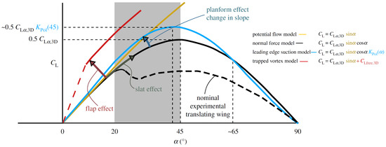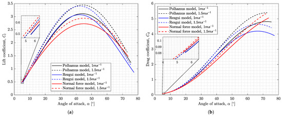 The Polhamus model has been proven to be effective for estimating the aerodynamic force coefficients of low aspect ratio delta wings up to moderate angles of attack () [62]. There are uncertainties concerning whether the Polhamus model can be fully applicable to the conditions of insect and samara flights, where the maximum operating are much higher (, respectively). Nonetheless, a few researchers [23,27,63] have applied the Polhamus model to describe the lift and drag of low aspect ratio flapping/revolving wings.