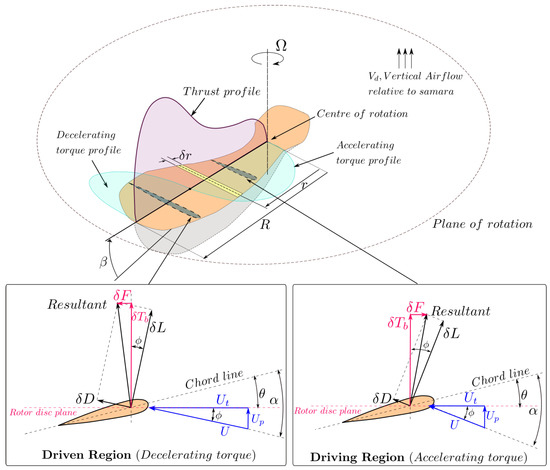 The rest of the section briefly summarises the main mathematical equations governing the SNM code and its solution procedure. For the full derivation and details regarding the SNM, one can refer to [71,72]. For this analysis, we will be referring to the term “blade” as the rotating samara wing, which is producing lift and drag forces. To compute the lift and drag forces acting on each blade element, one must first evaluate the local flow velocity components and angle of attack. From Figure 6, the local or elemental angle of attack () can be defined as: