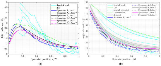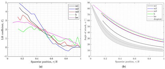 Spanwise distribution of (a) lift coefficient, and (b) angle of attack, , for model samara seeds. , , and h corresponds to Lentink et al.’s scaled samara models [20], with signifying Maple and Hornbeam seeds respectively. corresponds to the numerical samara model by Lee [46,75]. is a set of distributions estimated by the Samara Numerical Model, via analysing the droptest data of nine Acer pseudoplatanus samaras in natural descent. The SNM evaluation included the influence of uniform induced velocity across the span of the samara wing [72].