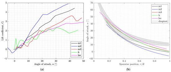 Figure 9 shows the updated plots after distributions were shifted by . Figure 9a reveals that the corrections were made such that all the samara models produce for . The shift in the angles also affected the peaks of the curves, leading to samara models to have to occur around , where data are available. The corrected curves with span, shown in Figure 9b, are also closer to the distributions estimated from droptests, which include the effect of induced velocity. Saying this, however, it should be noted that the match of angles of attack with the estimations from the droptests deteriorates for the outer region of the wing span. This mismatch can be due to the crude correction of applying a constant value of a corrective angle along the whole span of the wing, or due to the assumption of uniform induced velocity used in the estimation of from the droptest data. The true angles of attack can therefore be said to be between the curves shown in Figure 7b and Figure 9b.