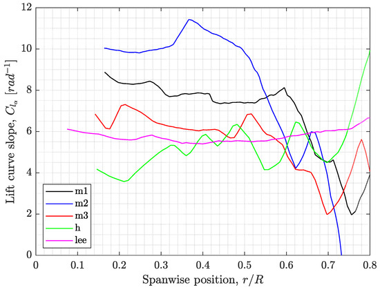 Variation of lift curve slope, , along the span for the samara models.