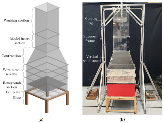 Low-speed vertical wind tunnel. (a) Schematic with modules labelled, (b) Photograph of the vertical wind tunnel.