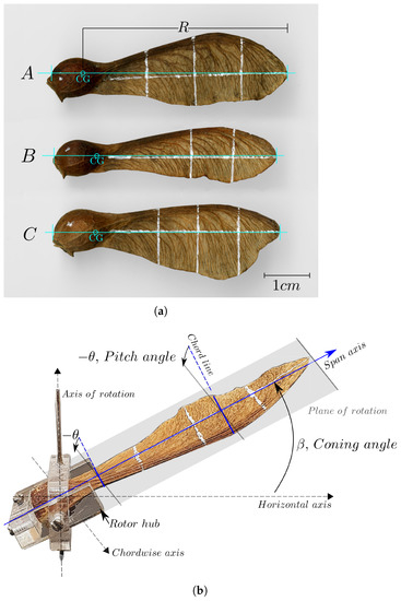 For the wind tunnel testing, the species of interest were the Sycamore samaras (Acer pseudoplatanus). Sycamore seeds, in dried and ripe conditions, were collected in Bristol, UK, and stored in an airtight environment. With the experiment focused on generating a comprehensive set of flight data for a single samara, three prime samaras, labeled herein as Sycamore A, B, and C, were handpicked from a group of Sycamores (total of nine) that were formerly droptested in a different study [72]. In particular, Sycamore A samara was the individual that recorded the lowest descent rate in natural descent ( 0.97 ms), followed by Sycamores B and C ( 0.98, 1.08 ms, respectively). The wing planform of the Sycamores, along with their geometrical parameters, are presented in Figure 13a. It is important to note that the three Sycamores possess distinct wing shapes, as well as differing wing traits (camber, thickness, surface roughness, etc.), which will in turn influence the flight performance and the LEV strength of the Sycamores.