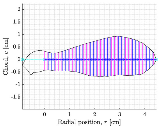 In order to assess the and models, a simple Samara Numerical Model (SNM) was developed. The numerical model is based on the Blade Element Momentum theory (BEM), which is a modelling approach widely used in the rotorcraft and wind turbine sector to estimate the performance of spinning rotor blades [69,70]. The BEM theory comprises of two parts. The first half is the Blade Element Theory, which breaks the spinning rotor blade into a finite number of ‘blade elements’ and for each element, the local flow velocities, angles of attack, and Reynolds number are evaluated. Subsequently, with relevant 2D force polars, the BEM model can calculate the local aerodynamic forces and moments acting on each blade element, which can be summed up to output the total force produced by the rotating blade. The second half is the Momentum theory, which looks at the rotating blade as a whole rotor disc. The Momentum theory can be used to obtain the distribution of the induced flow velocities, which in turn affect the aerodynamic forces calculated by the Blade Element theory. Other low-order methods such as the vortex line or panel methods can also be used to estimate the induced velocities, but in this study, the Momentum theory was deemed adequate, particularly since samaras were found to operate in what is known in the rotorcraft field as the windmilling break state [71].