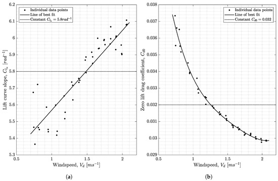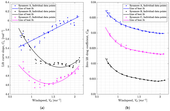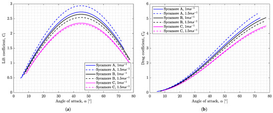 The Polhamus coefficients and can be calculated if data of lift and induced drag coefficients are available for a given wing, using a calculation method expressed by Polhamus [62]. For example, Rezgui et al. [27] used and of 3.57 rad and 2.57 rad for their samara analysis. The lift and induced drag coefficients were calculated using Tornado [64] with crude approximations, that simplified the samara platform as a rectangular wing of