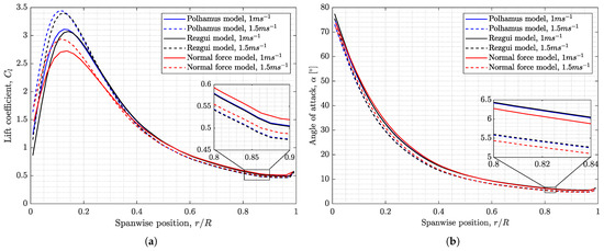 However, looking closely at the curves of Figure 8, one can spot that some parts of the curve are not realistic. For example, for the m2 samara, negative values are not expected for the relatively high positive angle of attack of . Lentink et al. pointed out that the negative is due to the tip vortex creating a net flow that comes from above. However, it appears that the tip vortex effect is not reflected in Figure 8, where ideally the tip vortex region should have a negative . This mismatch originates as Lentink et al. and also Lee, calculated their radial distribution directly from the advance ratio ( = , where ), which excludes the effects of radial/spanwise-induced velocities (). Note that if one includes the effects of induced velocities, the radial angle of attack becomes . Therefore, in reality, can significantly influence the flow and reduce the value of . The grey region in Figure 7b shows a more realistic distribution of autorotating samaras. These distributions were derived by the current authors, via numerically analysing the vertical autorotative descent of nine Acer pseudoplatanus samaras using the SNM. Even though the numerical model simply assumed to be uniform across the span of the samara [72], it is clear that the influence of greatly lowers the distribution.