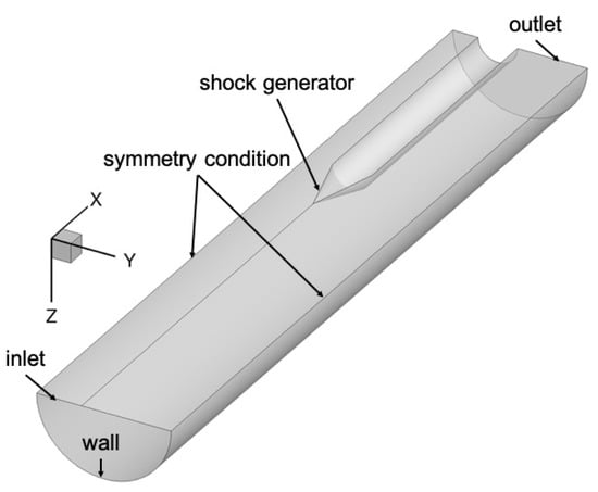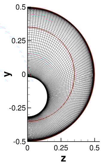 If the shock generator is not aligned with the centerline, the flow field becomes 3D and symmetry conditions can only be applied in relation to the plane that intersects the test section and the shock generator centerline at (the current setup’s reference plane). As a result, the computational domain for the RANS calculation and ILES had to span half of the circumference (180 degrees). Using analytical functions, a 3D grid for the precursor RANS calculation with centerbody offset of was generated. The inflow and outflow boundaries were positioned at and , respectively. The location corresponds to the start of the test section in the experiment. The number of cells in the axial, radial, and azimuthal direction was . Because the freestream was quiescent, the grid resolution requirement outside the boundary layer is low and grid line stretching was employed away from the walls. An outline of the 3D computational domain for the asymmetric RANS calculation is provided in Figure 1. Figure 2 presents a cross-sectional view of the RANS grid at the outflow.