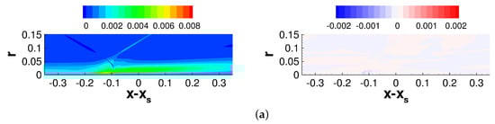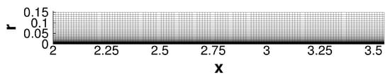 A compressible finite-volume Navier–Stokes code [,] was employed for the axisymmetric and asymmetric precursor RANS calculations and the ILES. The viscosity was obtained from Sutherland’s law and the heat conduction coefficient was obtained from , where is the dynamic viscosity, is the specific heat at constant pressure, and is the Prandtl number. Ninth-order and fourth-order accurate discretizations were employed for the convective and viscous terms of the Navier–Stokes equations. For the RANS equations, a discretization with second-order accuracy was utilized.