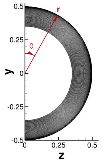 Cross—sectional view of computational grid for asymmetric ILES. To improve clarity, every other grid line was excluded in both the wall−normal and spanwise directions. The r and directions of the cylindrical coordinate system are included for future reference (marked in red).