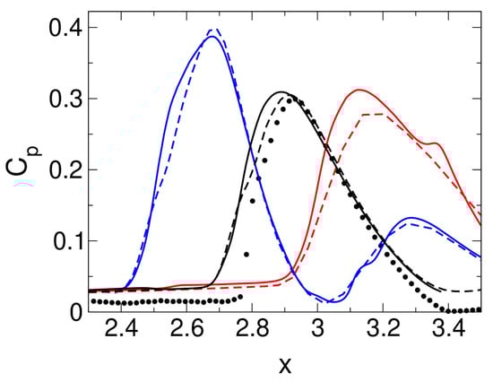 Wall-pressure distributions obtained from temporal averages. Symbols are measurements by Davis et al. [] for axisymmetric interaction at . Solid and dashed black lines are for ILES and RANS of axisymmetric interaction. Solid and dashed red () and blue () lines are for ILES and RANS of asymmetric interaction.