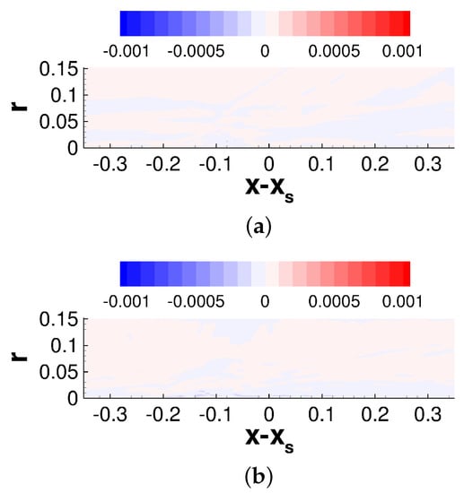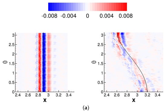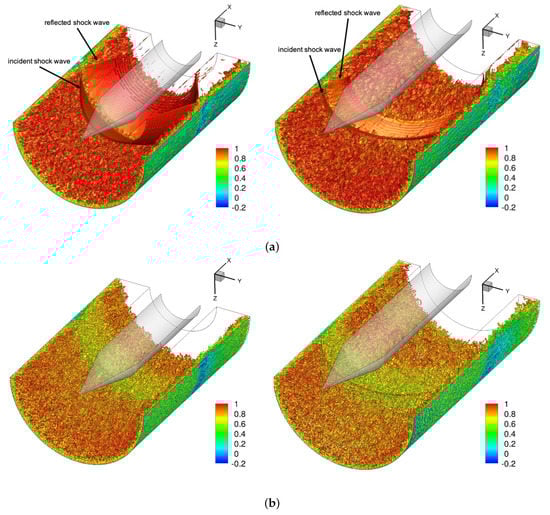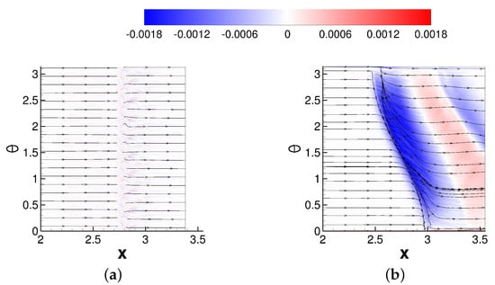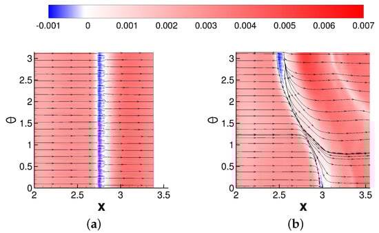 Considerable crossflow for the asymmetric case is revealed by the iso-contours of the azimuthal component of the skin-friction coefficient, as shown in Figure 14. Beginning at separation and extending downstream of reattachment, there is a region of strongly negative azimuthal skin-friction (indicated by the blue region). The direction of the flow is away from the high-pressure region directly underneath the shock generator and towards the side that is furthest from the shock generator. A similar large flow turning across the interaction was observed by Chou [] and Sasson []. The crossflow is strongest near , as indicated by the azimuthal skin-friction coefficient contours and the skin-friction lines (Figure 14b). The presence of the reflected shock wave can be linked to a second region located further downstream, where the skin-friction coefficient in the azimuthal direction is negative.