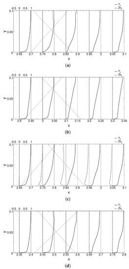 Profiles of the axial () and tangential () velocity for the axisymmetric (azimuthal average) and asymmetric interaction (for different locations) are compared in Figure 8 for different x-locations. The velocity scale is shown on the top of the profiles. The dotted lines indicate the incident and reflected shock waves. The profiles for the axisymmetric case (Figure 8a) are discussed first. The streamwise velocity profile at indicates weak reverse flow very close to the wall. The jump in the velocity profile near is due to the incident shock wave. The profile for (slightly downstream of reattachment) indicates a velocity deficit near the wall and a sudden velocity decrease at due to the reflected shock wave. The velocity deficit is also seen in the profiles for and . The azimuthal velocity component is zero for the axisymmetric interaction.